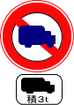 このような標識のある道路では、最大積載量が3トン以上の大型特殊自動車、大型貨物自動車、普通貨物自動車は通行できない。